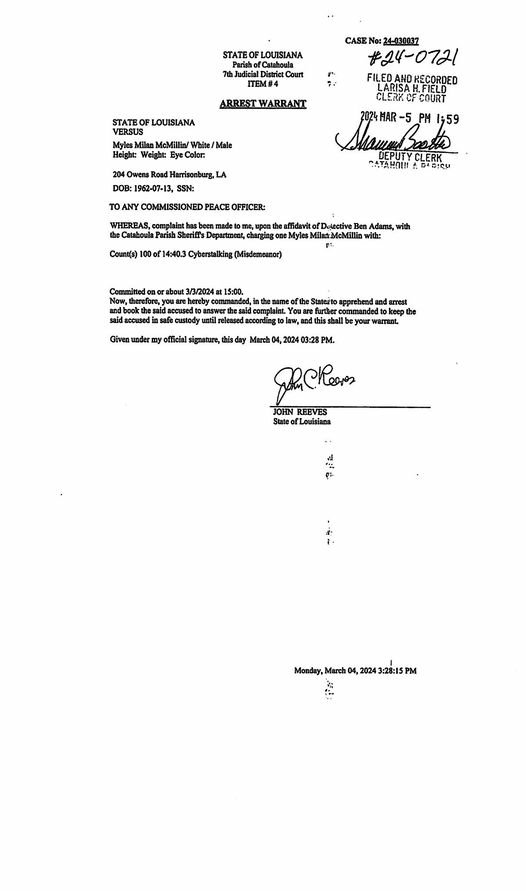 Judge Reeves signs an arrest warrant to have Myles arrested for Cyberstalking the Clown sheriff. Would this Judge have done the same for you or me? Of course not! We are “little people” and mean nothing to him! But the Clown sheriff, he’s an “important person.” You know! the old you scratch my back, I scratch your back, good old boy, bloodstained hands judge bullshit goes a long way in Catahoula Parish. “little people,” not so much! After all Myles was just another of those “little people” who mean nothing to the “True Powers” that be!