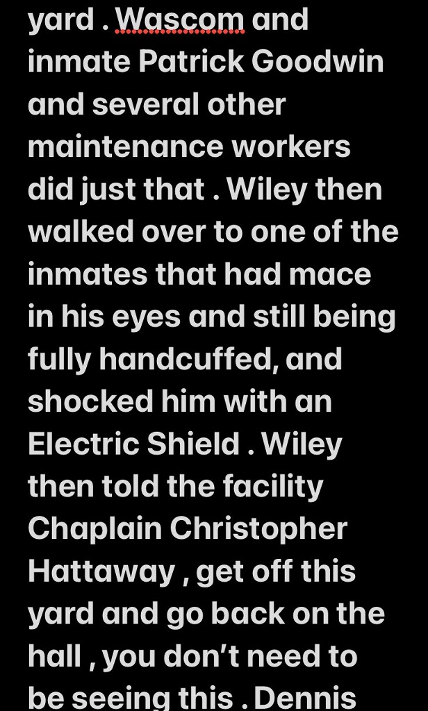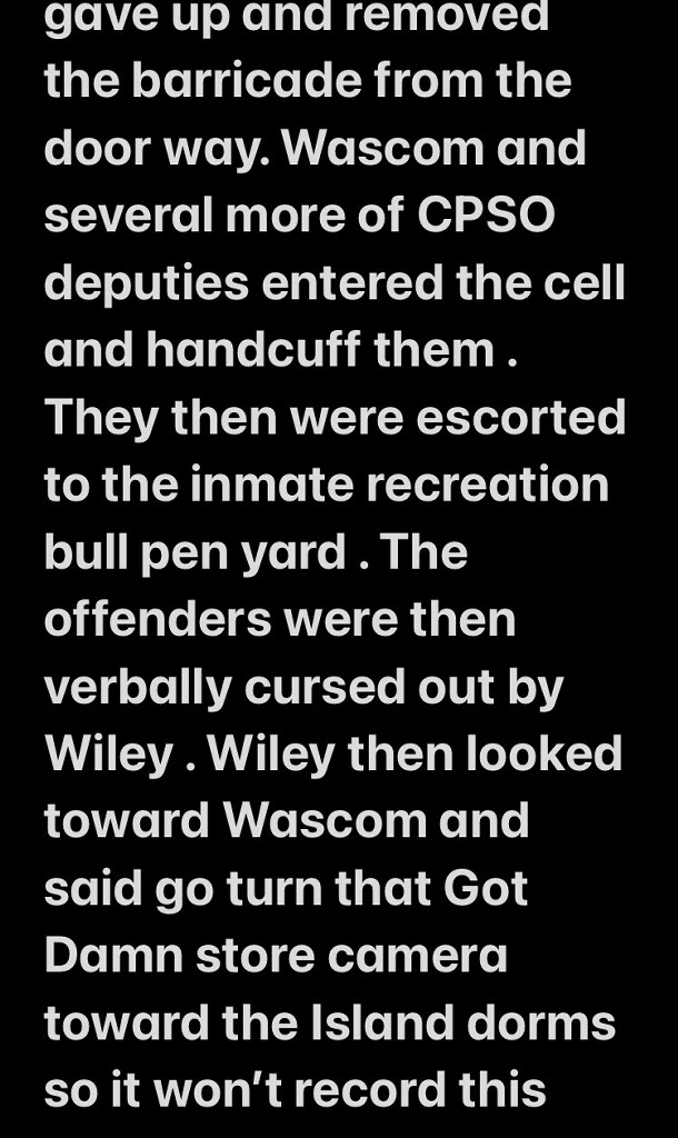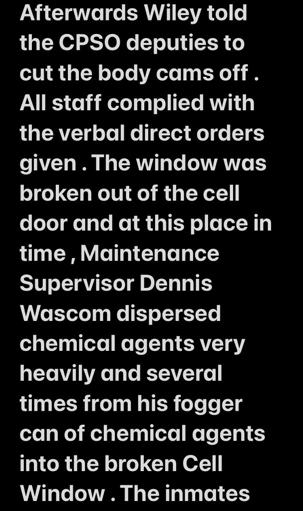 The former deputies stated the inmates were then handcuffed with their hands behind their back and moved outside to the facility yard and put face down on the ground. While the inmates were outside on the ground, a corrections officer and Warden Wiley peppered spayed all the inmates in the face, for a second time, while prone and handcuffed. Warden Wiley was also cursing and threatening the inmates telling them he was going to make an example out of them for forcing him to come to the prison on his time off.