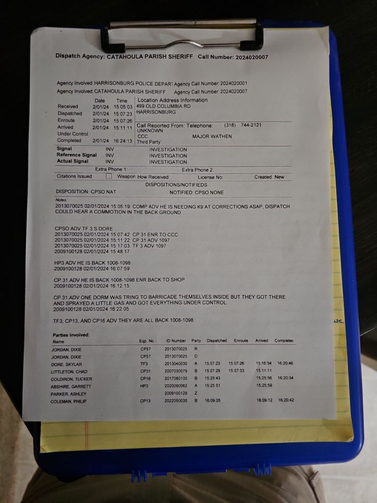 On February 1, 2024, the prison called the sheriff office and requested backup from the K-9 officer (That’s the same K-9 the Clown sheriff gave away two weeks later as being medically retired).